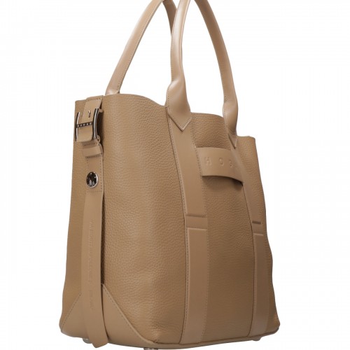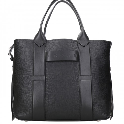 – Grained leather – Smooth leather inserts – Front handle with embossed Hogan logo – Fixed handles – Adjustable top compartment with personalized strap and buckle – Via Monte Napoleone address logo imprinted on left list – Hogan logo imprinted on the right list – Interior matching leather pouch and removable zipper – Metal feet – Fabric pouch included – Dimensions: H 40cm; W 32cm; D 16cm