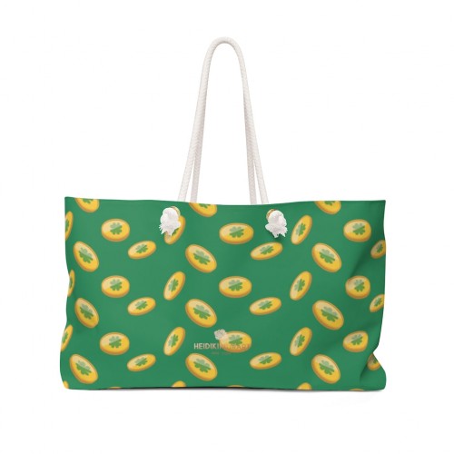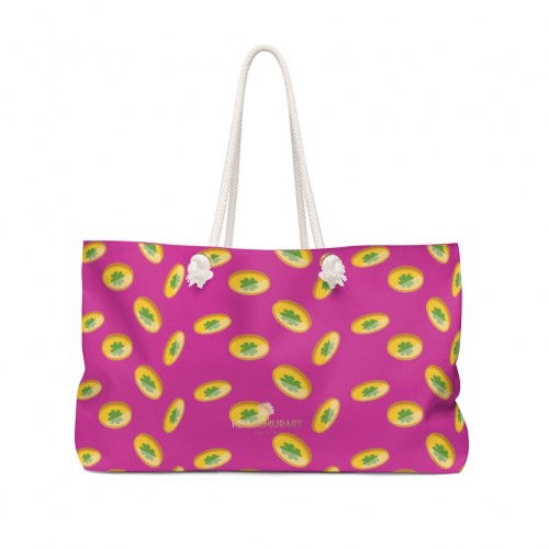Hot Pink Gold Coins Tote Bag, Hot Pink Green Clover With Gold Coins Print St. Patrick’s Day Designer 24″x13″ Designer Oversize Tote Weekender Bag-Designed and Printed in USA, Suitcases & Travel Bags Luggage, Four Leaf Clover Weekender Tote Bag, Bachelorette or Women’s Weekend Bag, St. Patrick’s Hangover Drunk Recovery Weekender Oversize Tote Bag