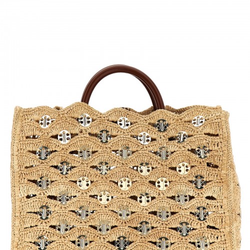 ‘Lova’ handbag in crocheted raffia, bucket style, adjustable leather handle, drawstring bag closure.