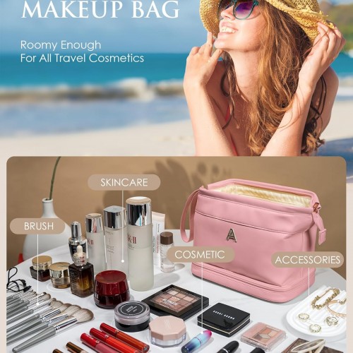 Initial Makeup Bag, Personalized Large Capacity Cosmetic Bag with Makeup Brush Organizer, Waterproof, PU Leather Pink Makeup Pouch Travel Skincare Bag, with 1 Drawstring Toiletry Organizers