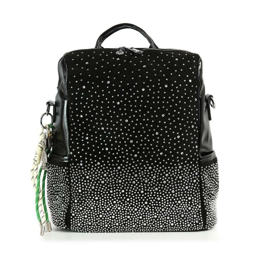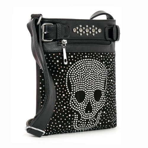 A classic crossbody sling in faux leather with a dazzling bling Skull, set upon a suede like front and finished off with tiny iridescent stones.