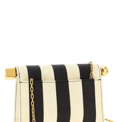 ‘La Petite Pochette Rond Carré’ striped raffia patchwork clutch bag with lambskin details, front metal lettering logo, folded magnetic closure, side metal ball and cube detail, cotton lining.