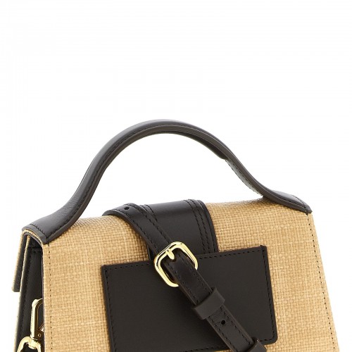 ‘Le Bambino’ handbag in woven raffia-effect fabric and smooth leather, magnetic flap closure, front metal lettering logo appliqué, fixed handle, back pocket, adjustable and removable shoulder strap.