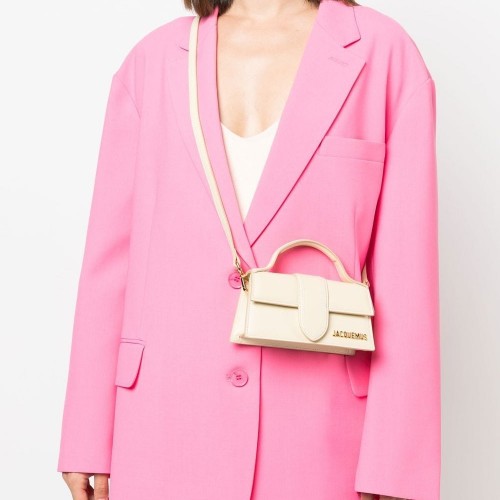 Le Bambino shoulder bag from JACQUEMUS featuring ivory white, calf leather, gold-tone logo plaque, foldover top with magnetic fastening, single shoulder strap, single flat top handle and main compartment.
