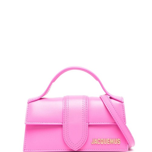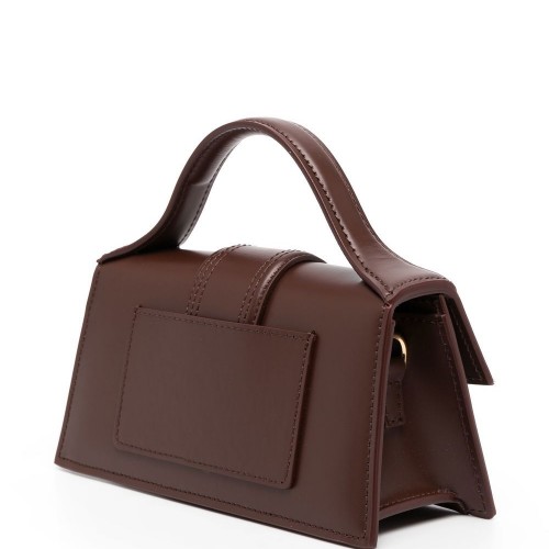 Le Bambino leather tote bag from Jacquemus featuring brown, calf leather, gold-tone logo lettering, foldover top with magnetic fastening, single flat top handle, adjustable detachable shoulder strap, main compartment, cotton lining and internal logo patch.
