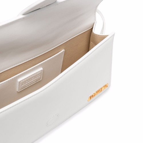 Bright-white leather Le Bambino Long tote bag from JACQUEMUS featuring gold-tone hardware, logo plaque, single shoulder strap and foldover top with magnetic fastening.