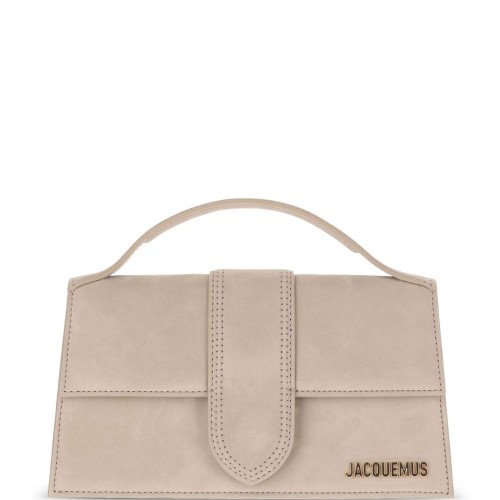 Jacquemus brown leather bag, featuring a front flap with magnetic closure, removable shoulder strap, single handle, metal logo lettering on the front and a flat rear pocket.