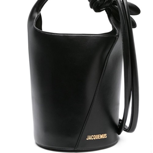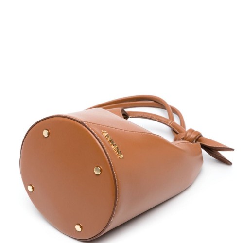 tobacco brown calf leather bucket body stitched edge knot detailing gold-tone logo lettering gold-tone hardware concealed press-stud fastening single rolled top handle two adjustable shoulder straps main compartment debossed internal logo internal card slot internal zip-fastening pocket canvas lining metal feet