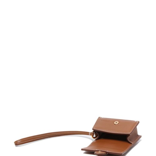 light brown calf leather contrast stitching debossed logo to the front foldover top wrist strap main compartment cotton lining AirPods compatible gold-tone hardware concealed press-stud fastening