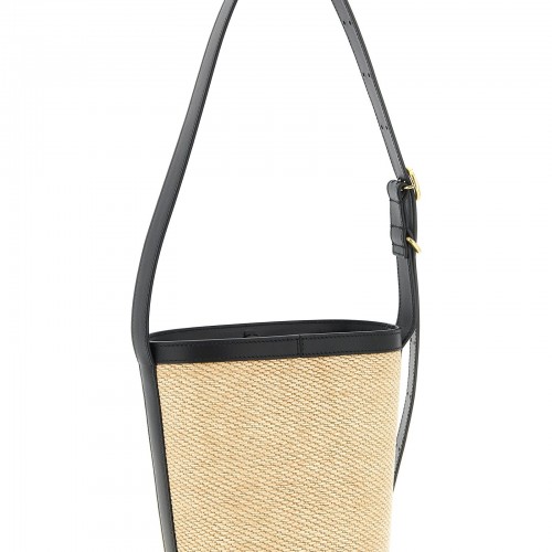 Contrast raffia and leather shoulder bag, front metal lettering logo, inner hook closure, adjustable shoulder strap with ‘Cannolo’ buckle, rigid base, nappa lining, removable clutch.