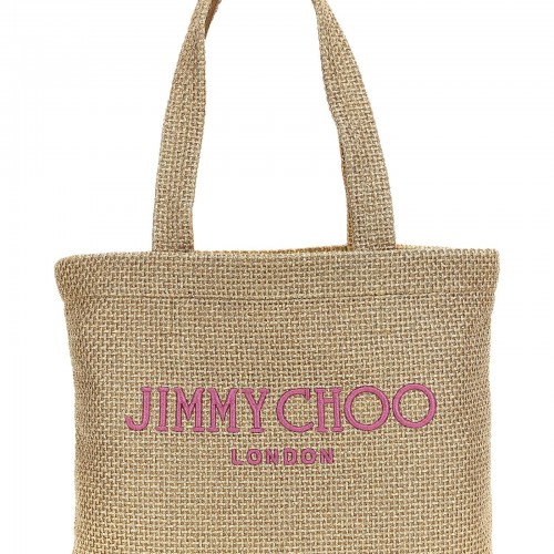 ‘Beach Tote East-West’ braided raffia shopping bag with front logo embroidery, double fixed handle.