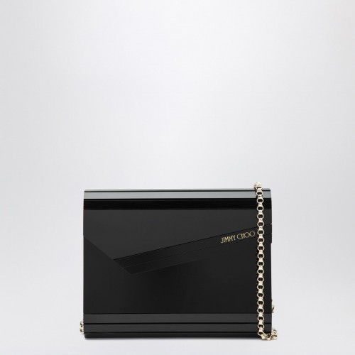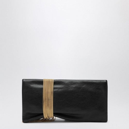 Jimmy Choo black leather clutch, featuring a front flap with magnetic closure and a metal pendant with gold finish, internal pocket and suede lining.