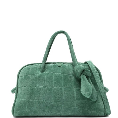 ‘Bon Bon’ bucket bag in laminated leather, fixed metal bracelet handle, chain drawstring closure with tassels, chain shoulder strap.
