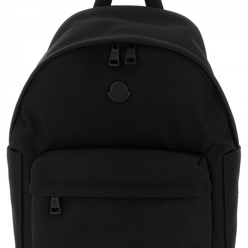 Nylon backpack, zip closure, front pocket, enameled logo tie rods, front logo lettering application.