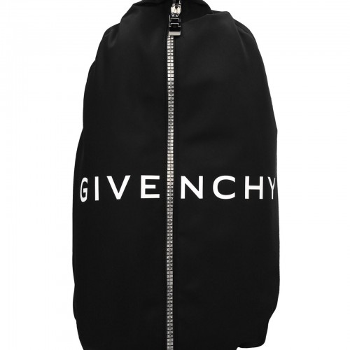 ‘Curb’ ntlon backpack with buckle and inner drawstring closure, outer zip pockets, adjustable shoulder straps.