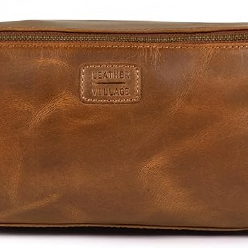 LEATHER VILLAGE Genuine Leather Dopp Kit – Large Travel Toiletry Bag with Waterproof Lining, Dual-Zip Design for Men & Women, Organizer for Shaving, Makeup & Essentials – Black
