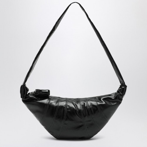 Medium Lemaire bag in black lambskin, characterized by a zip closure, an internal flat pocket, a croissant-shaped design, and silver-coloured metal hardware.