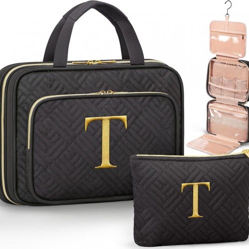 Letter Makeup Bags, Personalized Bags with Handle, Waterproof Double Layer Cosmetic Bag, Large Capacity PU Leather Makeup Bags Letter Travel Toiletry Bag with Makeup Brush Organizer