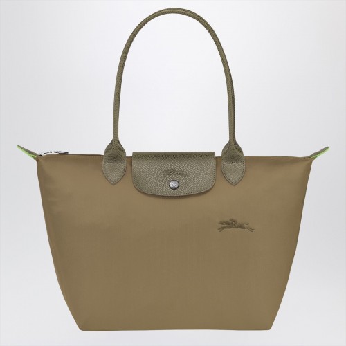 Large bag by Longchamp in Brick-coloured econyl recycled polyamide with brown leather details, featuring two top handle, foldover top with magnetic closure, zipper closure and main compartment.