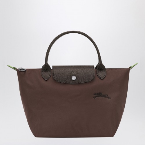Small handbag by Longchamp in graphite grey recycled fabric, with two tone on tone top handles, zipper closure and leather details. Foldable model.