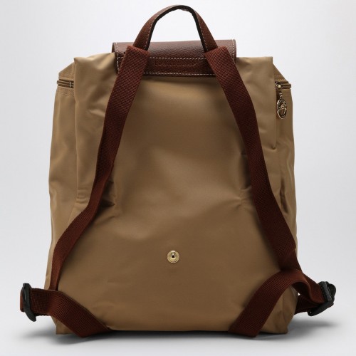 Medium backpack from Longchamp in fawn-coloured recycled canvas featuring a snap button, a zip fastening, leather details and an interior flat pocket.