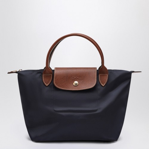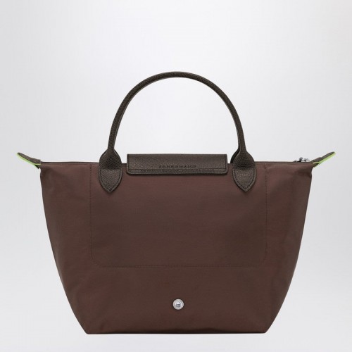 Small handbag by Longchamp in mocha-coloured recycled fabric, with two tone on tone top handles, zipper closure and leather details. Foldable model.