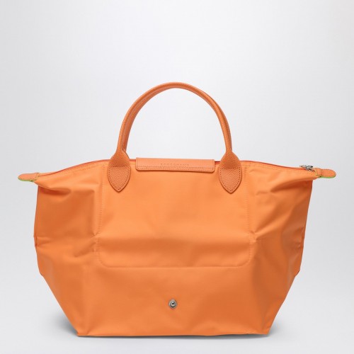 Medium handbag by Longchamp in orange recycled fabric, with two tone on tone top handles, zipper closure and leather details. Foldable model.