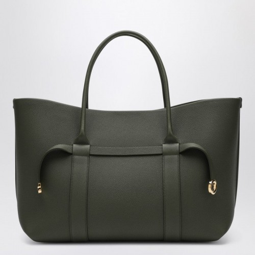 Large Loro Piana shopper bag in green grenadine leather, characterized by leather handles, leather lining, decorative closure, embossed logo in the centre of the shoulder strap, and removable internal pouch.