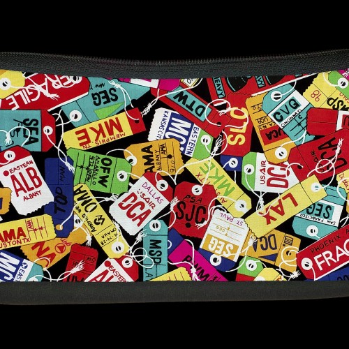 This water resistant travel pouch features an image of a vintage travel poster promoting service Lufthansa. The flip side is black.