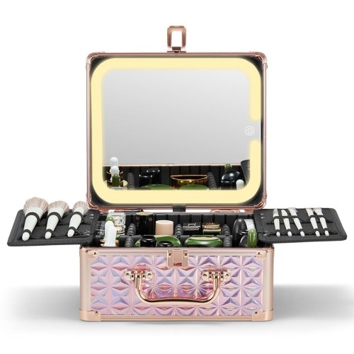 Makeup Travel Train Case with Mirror LED Light 3 Adjustable Brightness Cosmetic Bag Portable Storage Adjustable Partition Waterproof Makeup Brushes Makeup Jewelry Gift for Women