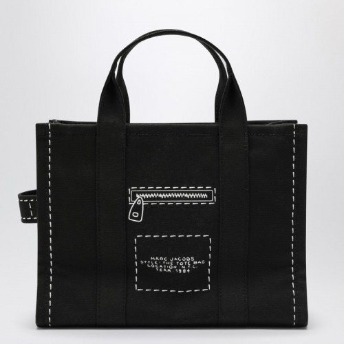 Marc Jacobs black leather shoulder bag, featuring a removable chain strap, removable leather top handle, zip closure, metal logo on the front, and internal compartments for cards.