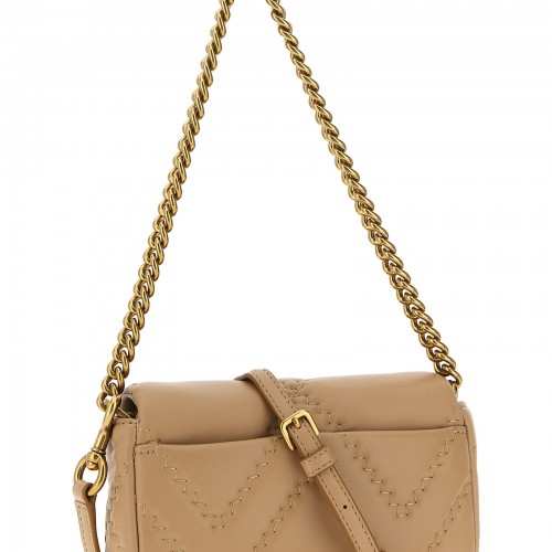 Leather shoulder bag with tone-on-tone stitching, magnetic flap closure with front metal logo, fixed chain handle, back pocket, adjustable and removable leather shoulder strap.
