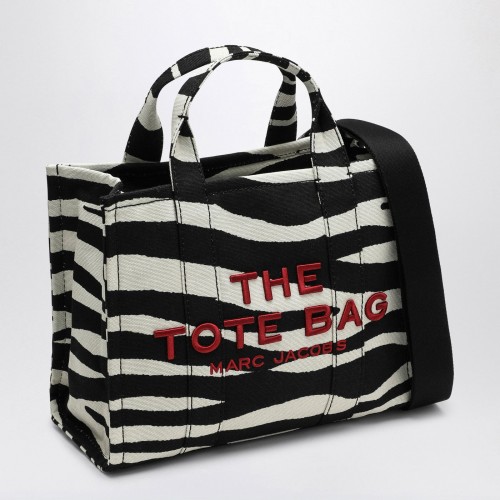 Medium black and white zebra print canvas tote bag from Marc Jacobs featuring red logo embroidery on the front, two handles, a zip fastening, a single compartment and an interior zip pocket.