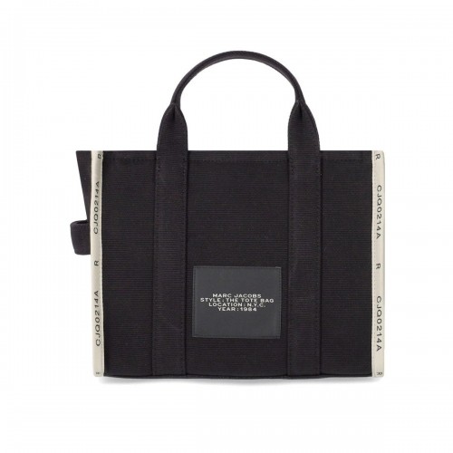 The Jacquard Medium Tote bag by Marc Jacobs made in black jacquard fabric, characterized by contrasting logo and edges. The interior features slip pockets, a zip closure, and an adjustable and removable shoulder strap. Measurements are 34x15x27 cm.