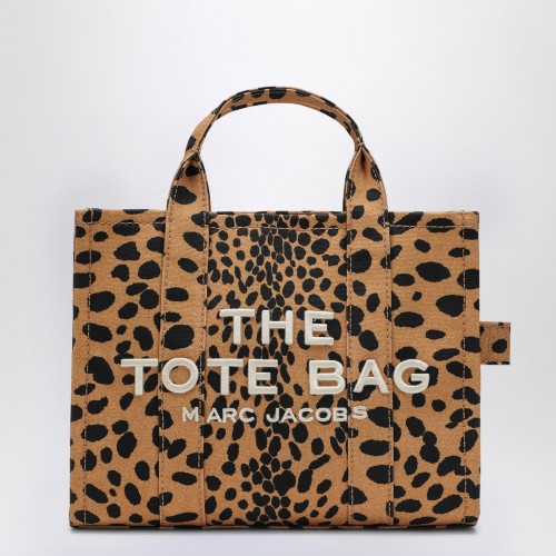 Large canvas handbag by Marc Jacobs in sand colour, featuring two top handles, zip closure, internal pockets, contrasting front logo lettering, and logo patch on the back.