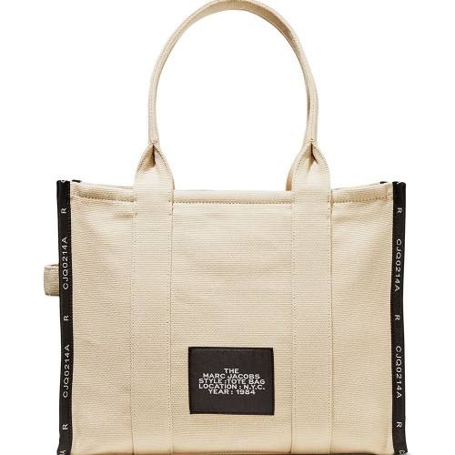 Beige/black cotton-blend large The Jacquard Tote bag from Marc Jacobs featuring jacquard logo motif, logo-tape detailing, logo patch to the rear, internal logo patch, top zip fastening, two top handles and main compartment.