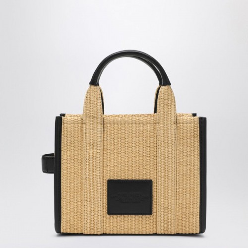 Small hand bag by Marc Jacobs in beige raffia, characterized by two top handles, zip closure, adjustable and removable shoulder strap, contrasting details, and contrasting front logo lettering.