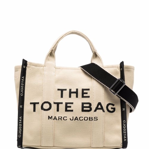 Beige canvas small The Canvas Tote bag from Marc Jacobs featuring logo print to the front, circular top handles and open top.