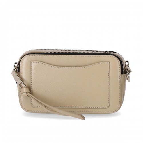 The Snapshot DTM crossbody bag by Marc Jacobs made of khaki saffiano leather, with a gold metal logo on the front. It has two zippered compartments, slip pockets inside, and a flat pocket on the back. Adjustable and removable logo fabric shoulder strap, measures 18x6x11 cm.