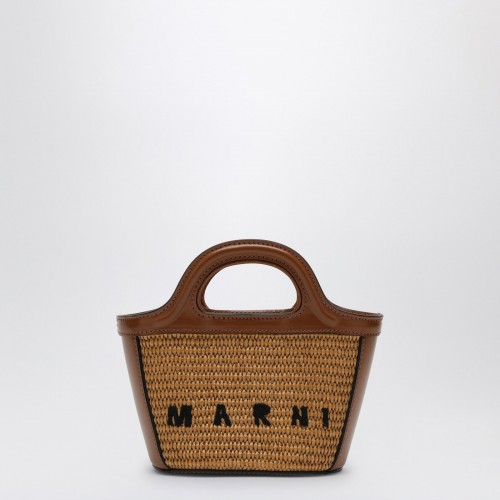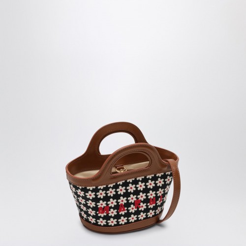 Black cotton Marni micro bag with daisy print, featuring two stiff top handles, contrasting lettering logo on the front, adjustable and removable shoulder strap and sewn logo on the inside.