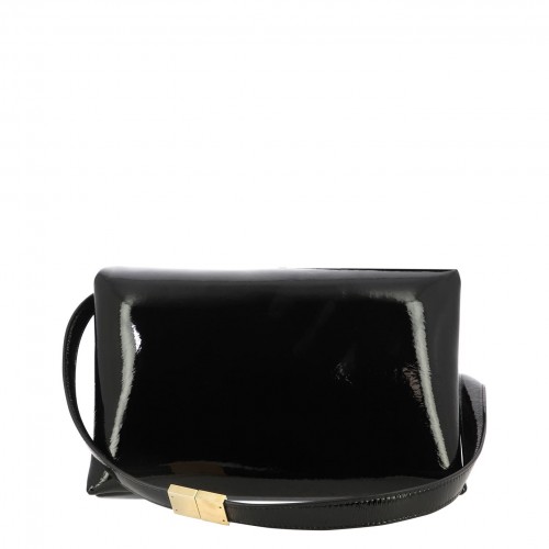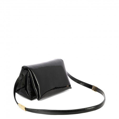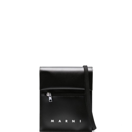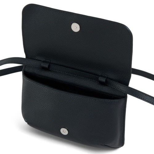 black calf leather grained texture embroidered logo to the front adjustable waist strap foldover top with magnetic fastening main compartment