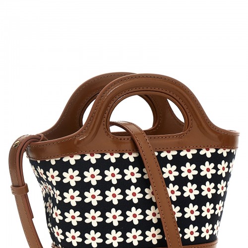 Micro ‘Tropicalia’ black canvas handbag with daisies print, leather details and handles, front logo embroidery, snap hook closure.
