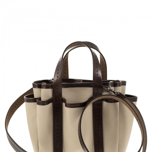 Giardiniera tote bag with a large and capacious design, mini version, made of pure cotton canvas. The model has a double handle, for hand carry, and several storage pockets on both sides and sides. Unlined interior compartment, closed with a snap hook. Finished with stitching and details in hand-padded leather with a wet effect, in the same colours. – Removable shoulder strap – Unlined interior – Double handle DESIGNER ID: 2414511023600 001