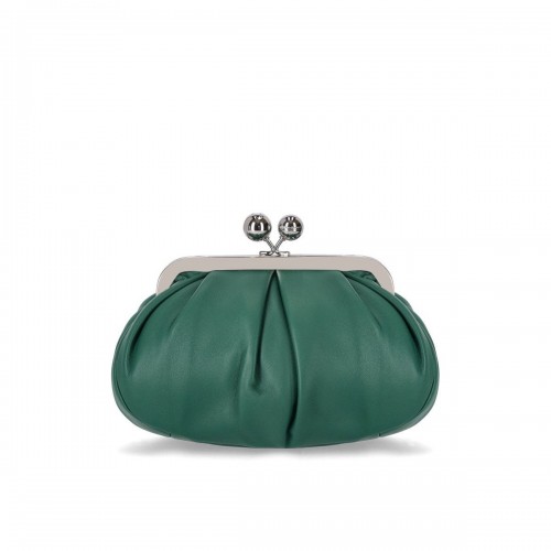 Pasticcino Provino clutch by Max Mara Weekend made of soft leather in a leather color. Silver metal details and iconic clip closure with branded spheres. Lined interior, leather shoulder strap and removable chain strap. Dimensions 47x17x27 cm.