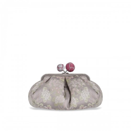 Pasticcino clutch by Max Mara Weekend made of light gray pure silk satin, decorated with a jacquard floral pattern. Closure with silk-covered boules, removable chain shoulder strap. Dimensions 19x10x15 cm.