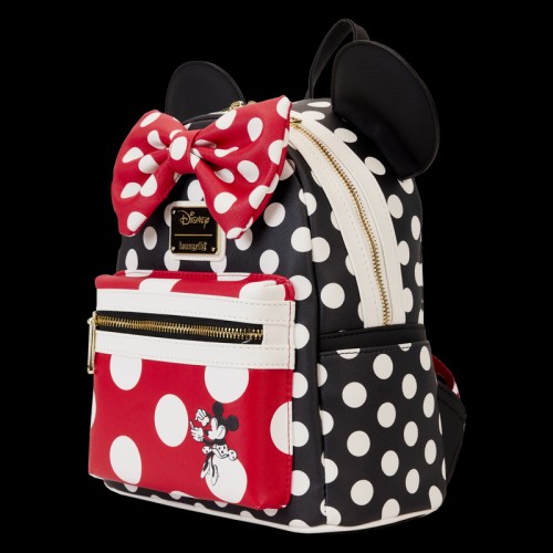 Our dotted line has a signature touch! This Loungefly Disney Minnie Mouse Rocks the Dots Classic Mini Backpack is a fresh and fabulous take on a classic style. A white dot pattern, against a black background, appears on the front, sides, and back of this accessory. The front pocket, and characteristic 3D bow at the top, offer pops of red color with white polka dots. On either side of the bow, Minnie Mouse’s ears rise up in applique detail. The front pocket also features a printed vintage image of Minnie Mouse herself. She’s seated upon a dot, freshening up her look in a compact mirror. There’s plenty of room to pack just what you need for a day’s journey, or for arriving on the dot to a fun event, in style.