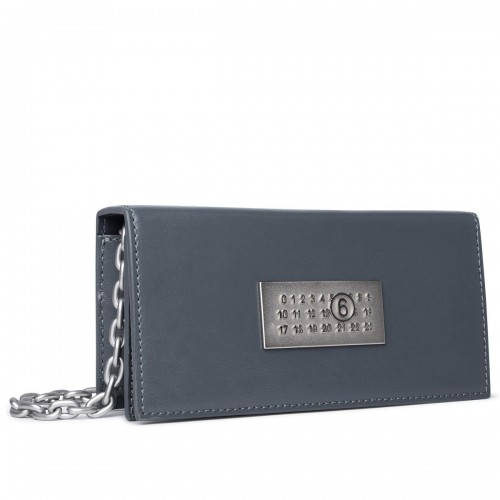 Textured leather, chain shoulder strap, metal plate with numeric logo, magnetic closure, white stitching on the back, two inner card pockets.n18 x 9 x 3.5 cm