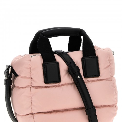 ‘Micro Caradoc’ water-repellent padded quilted nylon handbag, front silver metal logo patch, cotton lining, double fixed handle with leather handle, top zip closure, adjustable and removable leather shoulder strap.