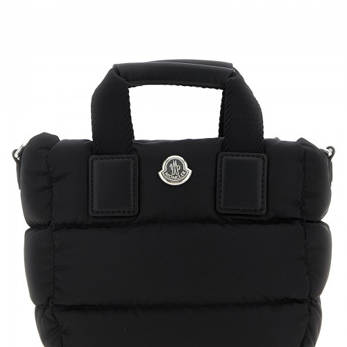 ‘Mini Caradoc’ water-repellent padded quilted nylon handbag, front silver metal logo patch, cotton lining, double fixed handle with leather handle, top zip closure, adjustable and removable leather shoulder strap.