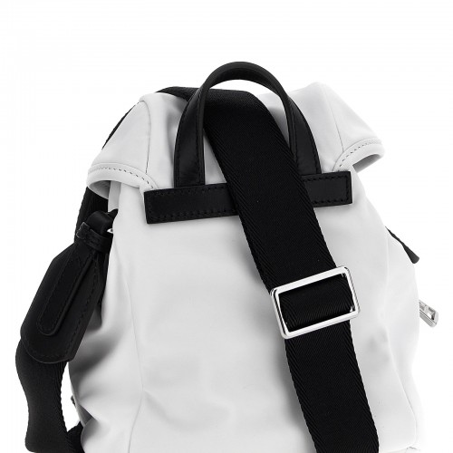 Water-repellent nylon ‘Mini Trick’ crossbody bag with leather details, front pockets with zip closure, adjustable and removable fabric shoulder strap, fixed handle, flap closure with tuc, inner drawstring.